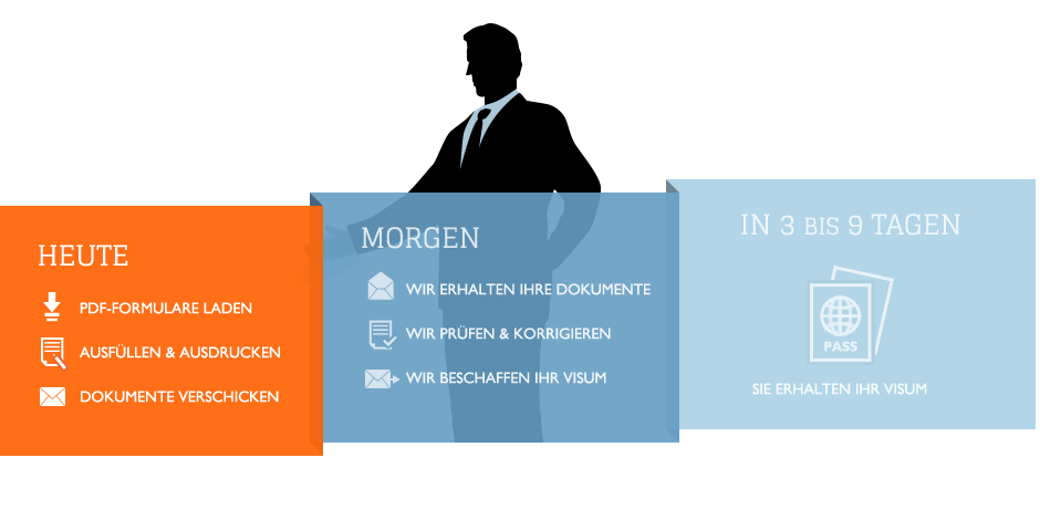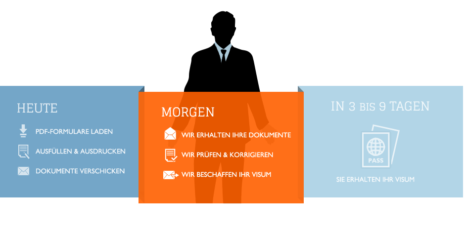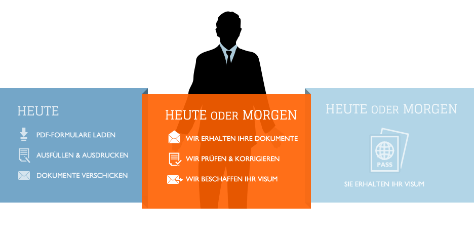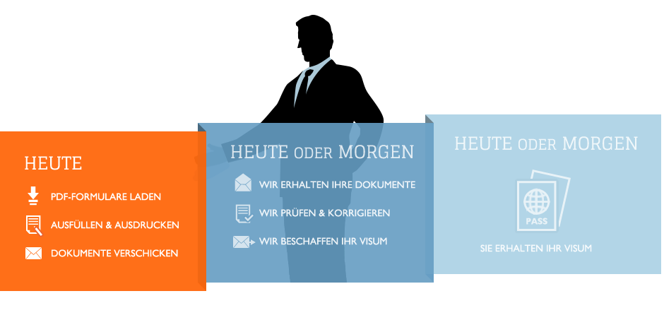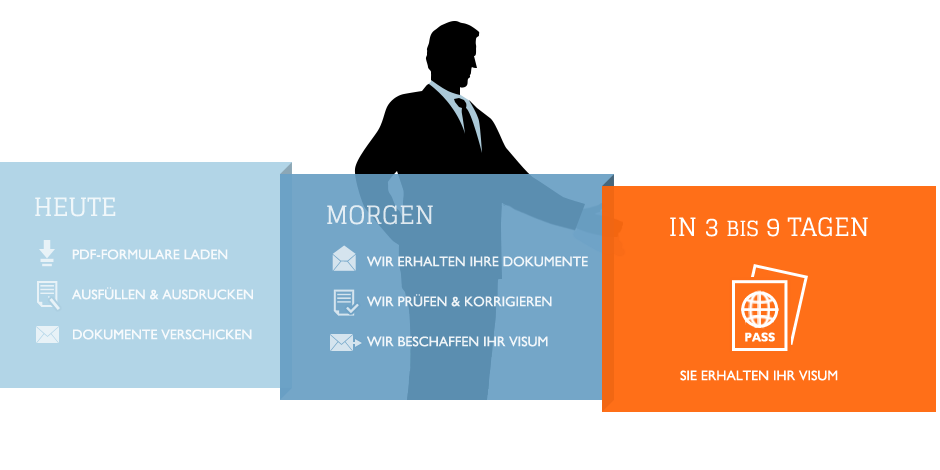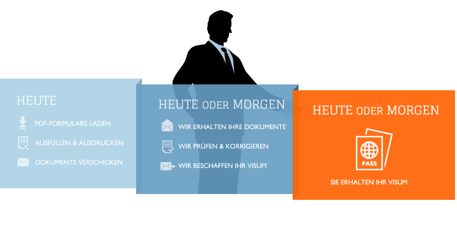 Sobald Ihre Dokumente bei uns eingelangen, machen wir uns unverzüglich an die Überprüfung Ihrer Unterlagen. Wir korrigieren die Anträge und nehmen, in Absprache mit Ihnen, notwendige Änderungen und Ergänzungen vor. Damit werden Verzögerungen auf dem Konsulat verhindert und eine rasche Abwicklung des Antrags gewährleistet. Im Anschluss reichen wir den Visum-Antrag für Sie ein und bezahlen die anfallenden Gebühren. Wir halten für Sie Kontakt mit dem Konsulat und informieren Sie über den aktuellen Stand des Antrags .